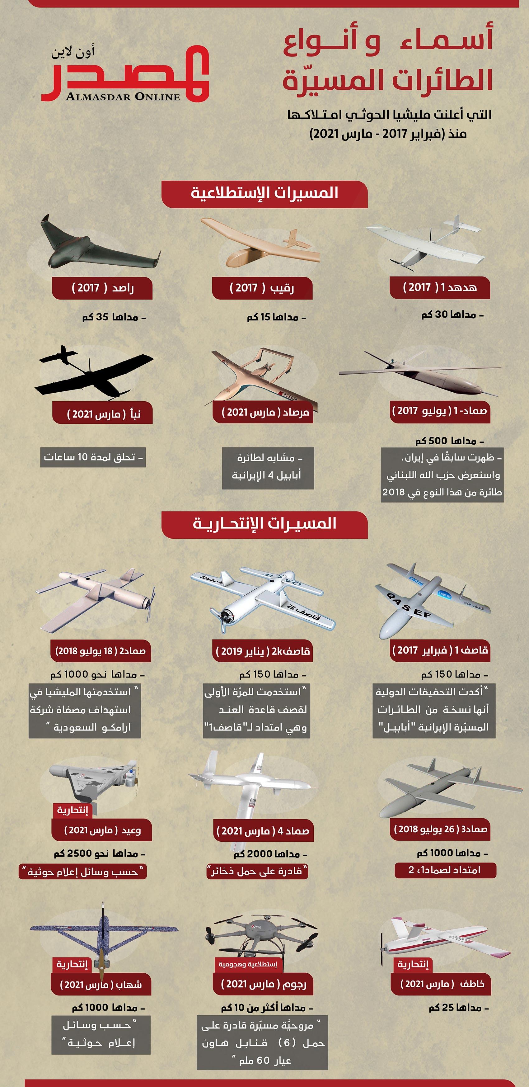 رسم بياني يوضح أنواع الطائرات المسيرة التي أعلنت مليشيا الحوثي حيازتها (المصدر أونلاين)