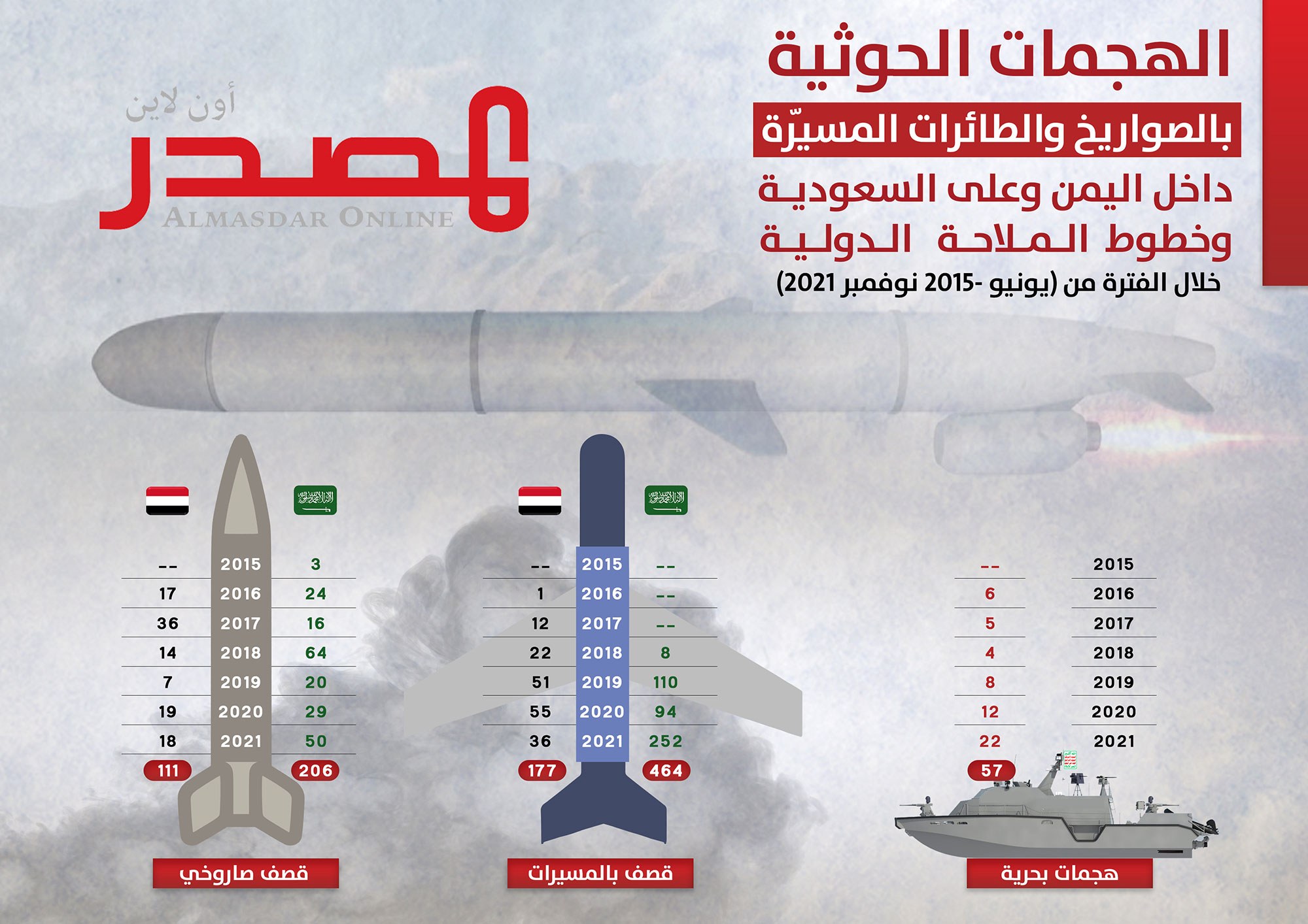ولا تشمل هذه الإحصائية، التي اعتمدت على المصادر المفتوحة، الصواريخ الباليستية والطائرات المسيّرة التي أطلقتها المليشيا الحوثية وسقطت قبل أن تصل أهدافها، سواء داخل اليمن أو باتجاه السعودية، وهي أيضاً أعداد كبيرة.