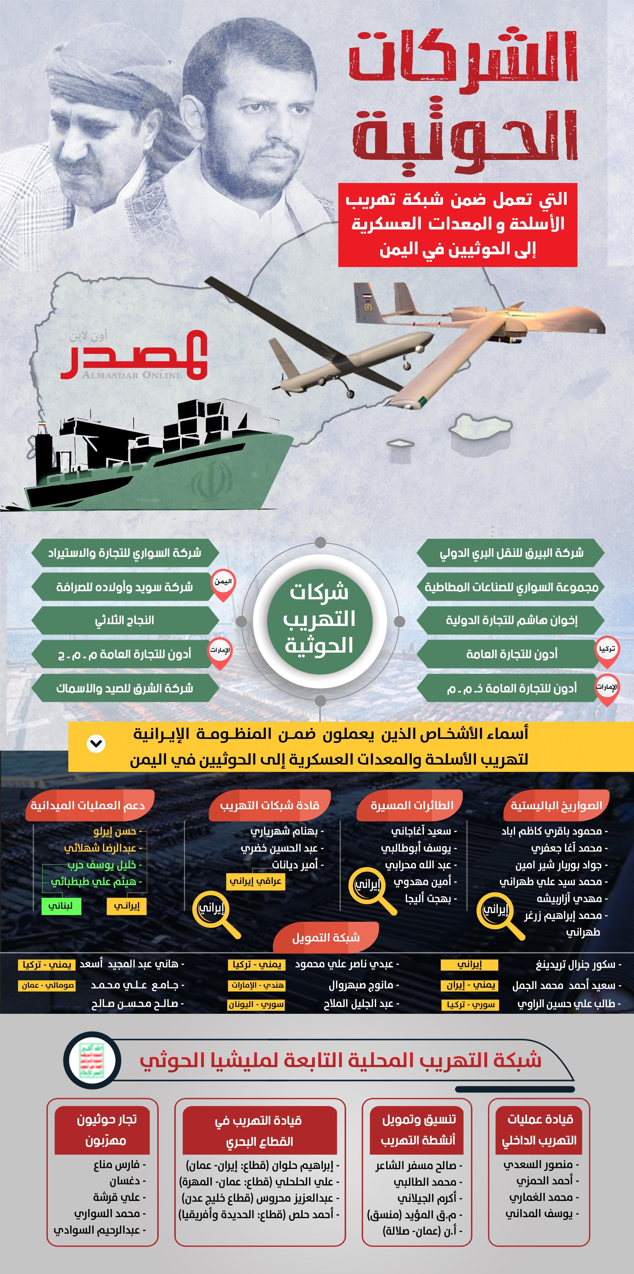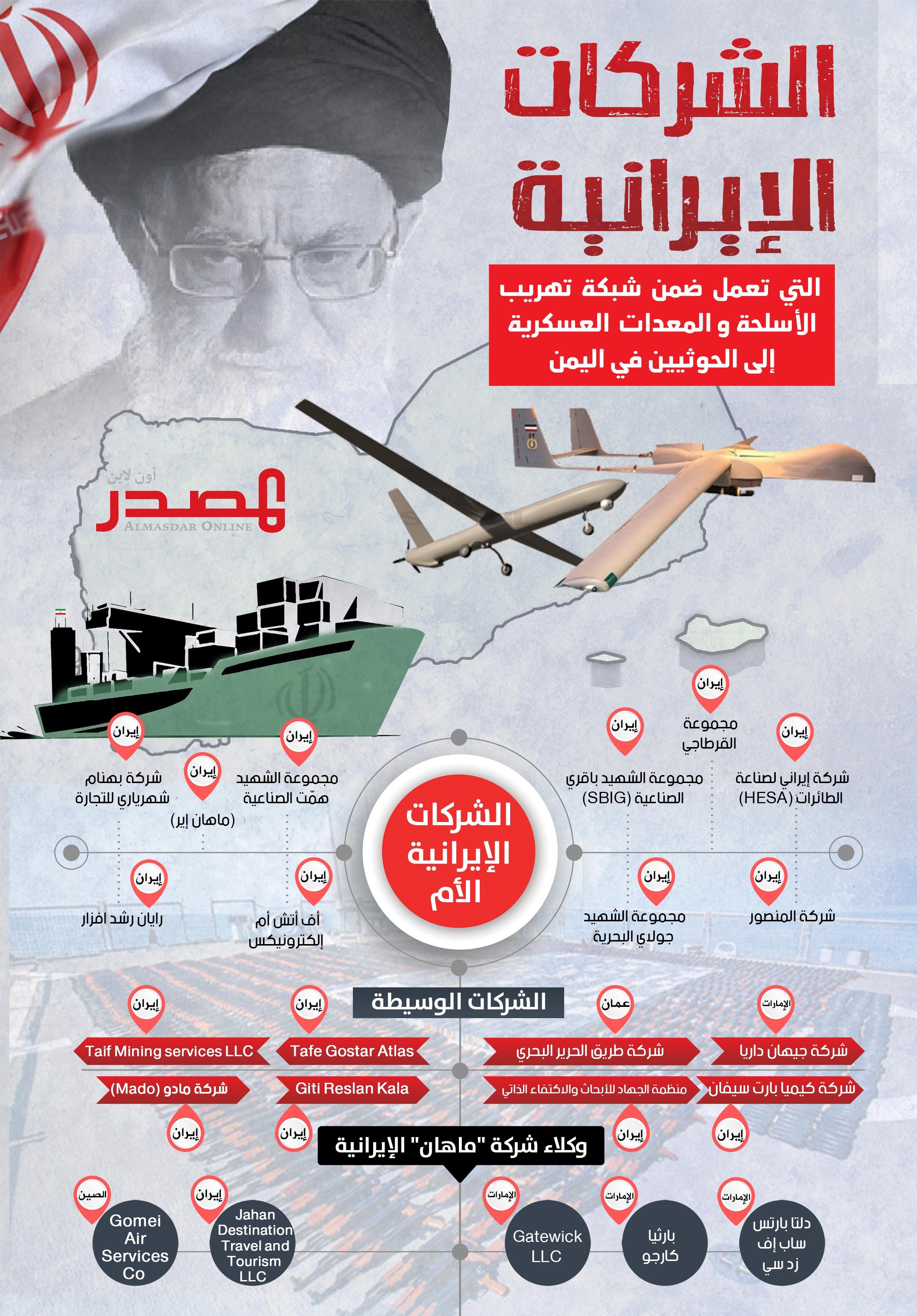 وفيما يتصل بنشاط التهريب، كشفت المعلومات والوثائق التي حصل عليها «المصدر أونلاين» من مصادر أمنية، عن (35) شركة صناعية وتجارية تعمل ضمن المنظومة الإيرانية لتهريب الأسلحة والدعم اللوجستي إلى مليشيا الحوثي في اليمن، منها (10) شركات إيرانية تملكها الدولة، وتعمل في مجال صناعة الطائرات والصواريخ الباليستية والمراكب البحرية والتكنولوجيا العسكرية وأخرى تنشط في مجال النقل الجوّي والبحري.