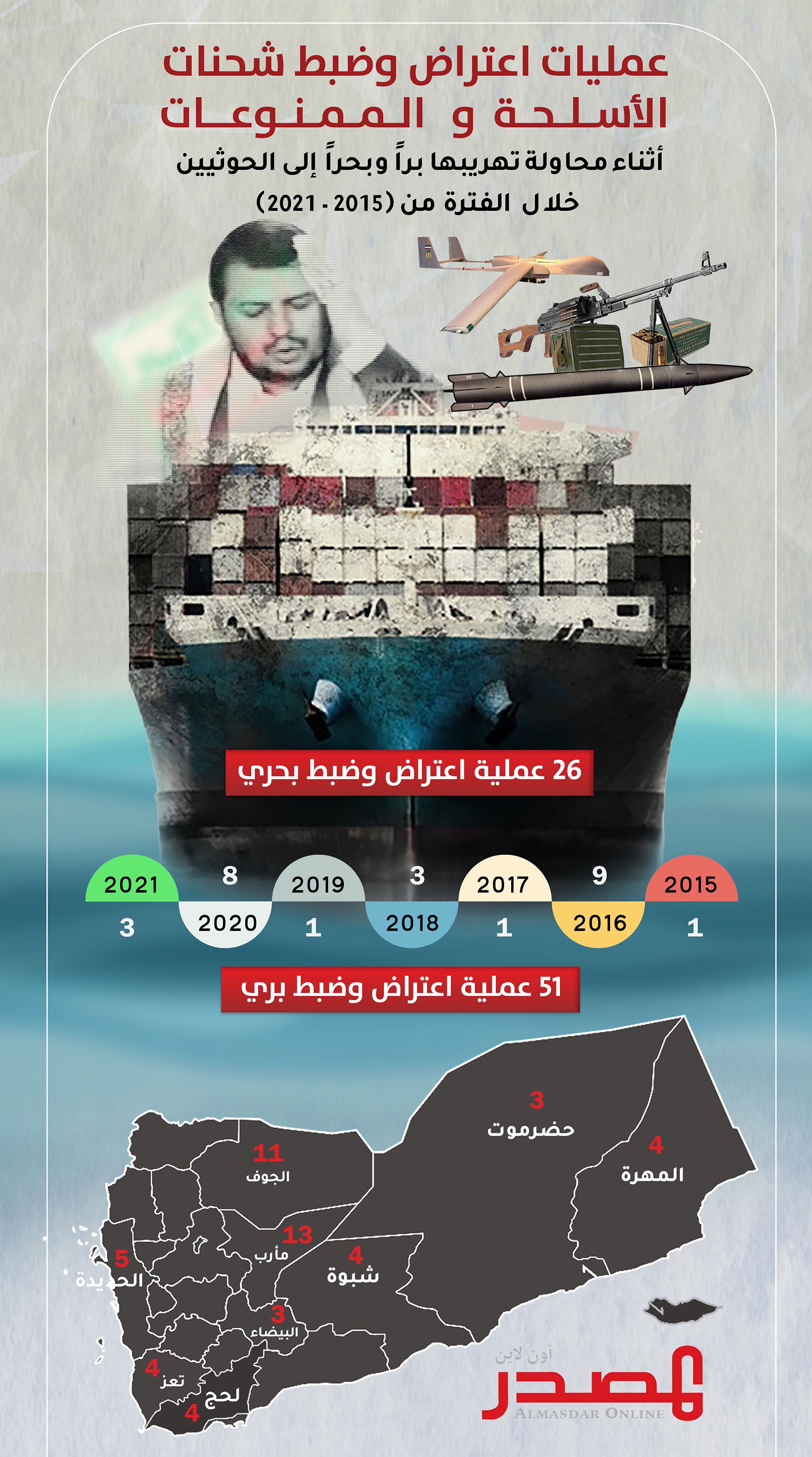 رسم بياني يوضح عمليات ضبط شحنات الأسلحة التي يهربها الحوثيون (المصدر أونلاين)