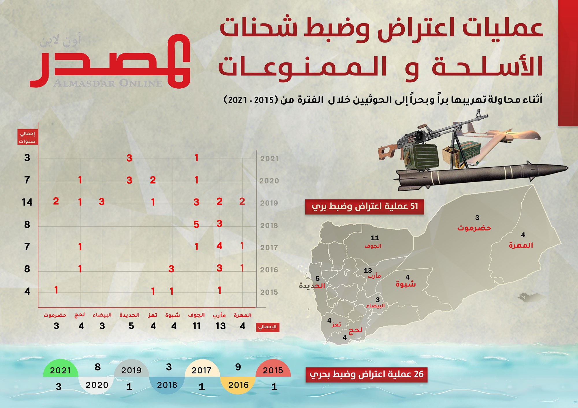 ويقدّم التحقيق، الذي استند لأكثر من (15) مصدراً عسكرياً وأمنياً ومصادر أخرى على اطلاع بأنشطة التهريب وإلى وثائق وتحقيقات محليّة ودولية ذات صلة، إحصائيات خاصة بأعداد الهجمات الحوثية داخل اليمن وخارجها، وإحصائيات بعمليات استهداف هذه القدرات، سواء من خلال ضبط شحنات الأسلحة والمعدات العسكرية أثناء محاولة تهريبها أو استهداف الورش والمخازن التي تستخدمها مليشيا الحوثي لتجميع وتخزين الصواريخ والطائرات والزوارق.
