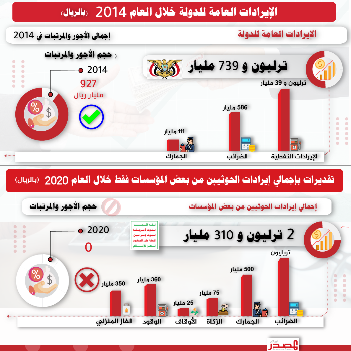 وبحسب عاملين في المؤسسات المالية في صنعاء فإن إجمالي الضرائب التي يجمعها الحوثيون الآن في مناطق سيطرتهم يفوق بأضعاف ما كانت تجمعه الحكومة في كل محافظات الجمهورية قبل الحرب. وأقرب الأرقام التي توصلنا إليها بأن إيرادات الحوثي من الضرائب وحدها تتجاوز ترليون ريال سنويا، وهو رقم قادر على دفع رواتب الموظفين في كل محافظات الجمهورية. وما كشفه فريق لجنة الخبراء الدوليين التابع للأمم المتحدة وأكدته مصادرنا بحسابات وتقديرات متحفظة مقترنة بتحليل للوثائق التي جمعها الفريق تشير إلى أن جماعة الحوثي جمعت أكثر مليار و800 مليون دولار، بما يعادل أكثر من ترليون ريال يمني، (الدولار يساوي 600 ريال في مناطق سيطرة الحوثيين) خلال العام 2019، وأن هذه المبالغ كانت مخصصة لدفع رواتب الموظفين المتوقفة منذ سنوات، لكنّ جماعة الحوثي، أنفقت جزءاً كبيراً منه على القطاع العسكري، لتمويل عملياتهم.