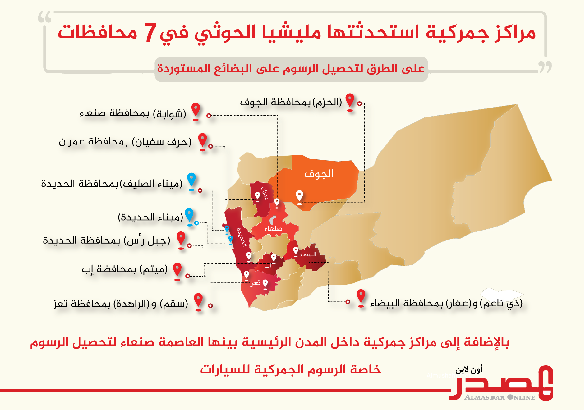 مراكز جمركية استحدثتها ميليشيا الحوثي في سبع محافظات (المصدر أونلاين)