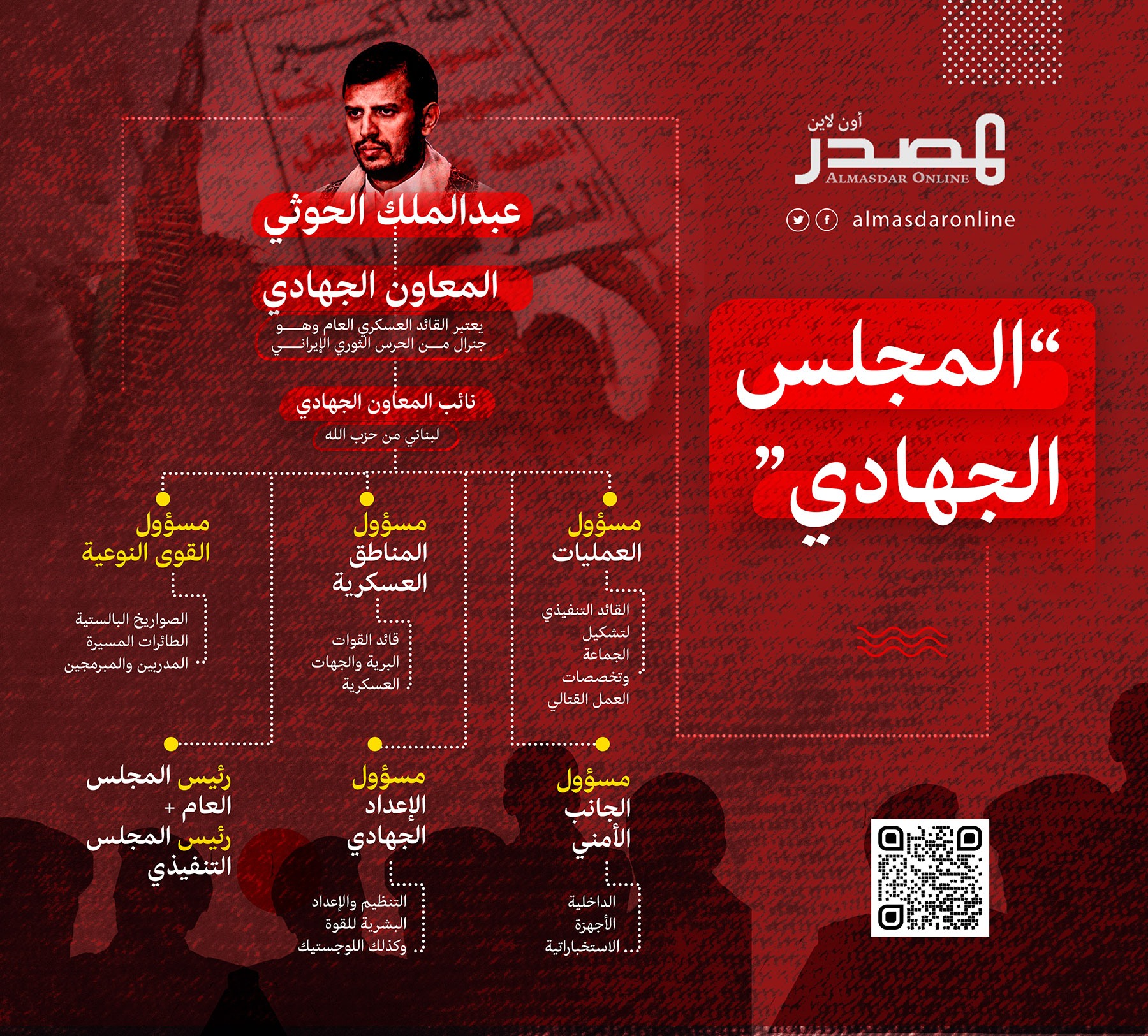 - المعاون الجهاديلعبد الملك الحوثي هو الشخصية المحورية ويُعدّ الممثل المركزي لمحور المقاومة – الحرس الثوري الايراني، (عملياً هو القائد العسكري)، وهو جنرال إيراني من فيلق القدس، ولديه سلطة واسعة في اتخاذ القرار وتوجيه مسارات العمل الجهادي الاستراتيجي، ويتولى الإشراف على تطوير القدرات النوعية واستقدام المدربين وتطوير هياكل البنية العسكرية وتنظيمها. نائبه من حزب الله اللبناني، ويسندهم مجموعة من الخبراء الإيرانيين واللبنانيين.