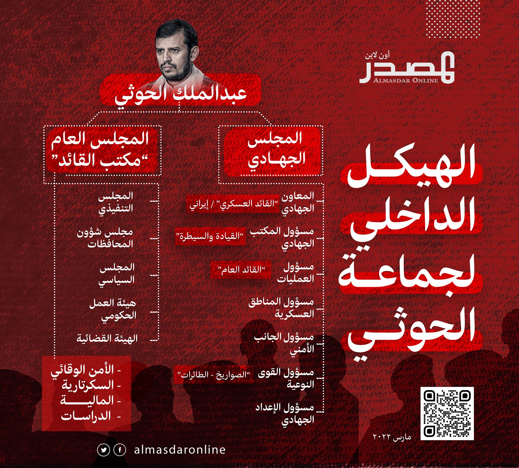 في هذه التحقيق نحاول تسليط الضوء على التركيبة والهيكلية الحقيقية للجماعة الحوثية ومؤسساتها التنظيمية الداخلية؛ استناداً إلى عشرات المصادر والمقابلات والمستندات والوثائق والتحقيقات وسنوات من التتبّع والتقصي، لبناء مجسَّم تقريبي وواضح لهيكل الجماعة المسلحة.