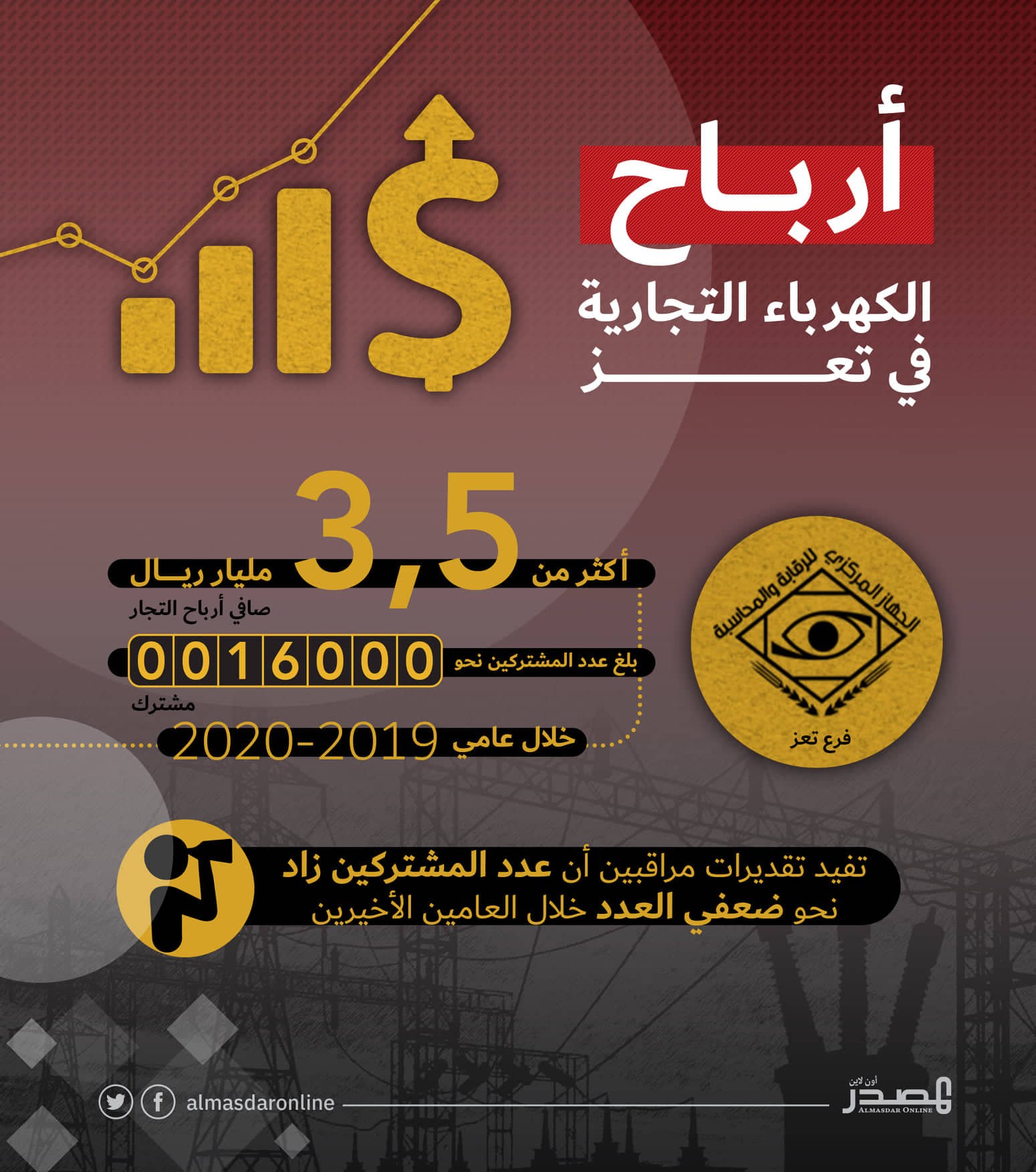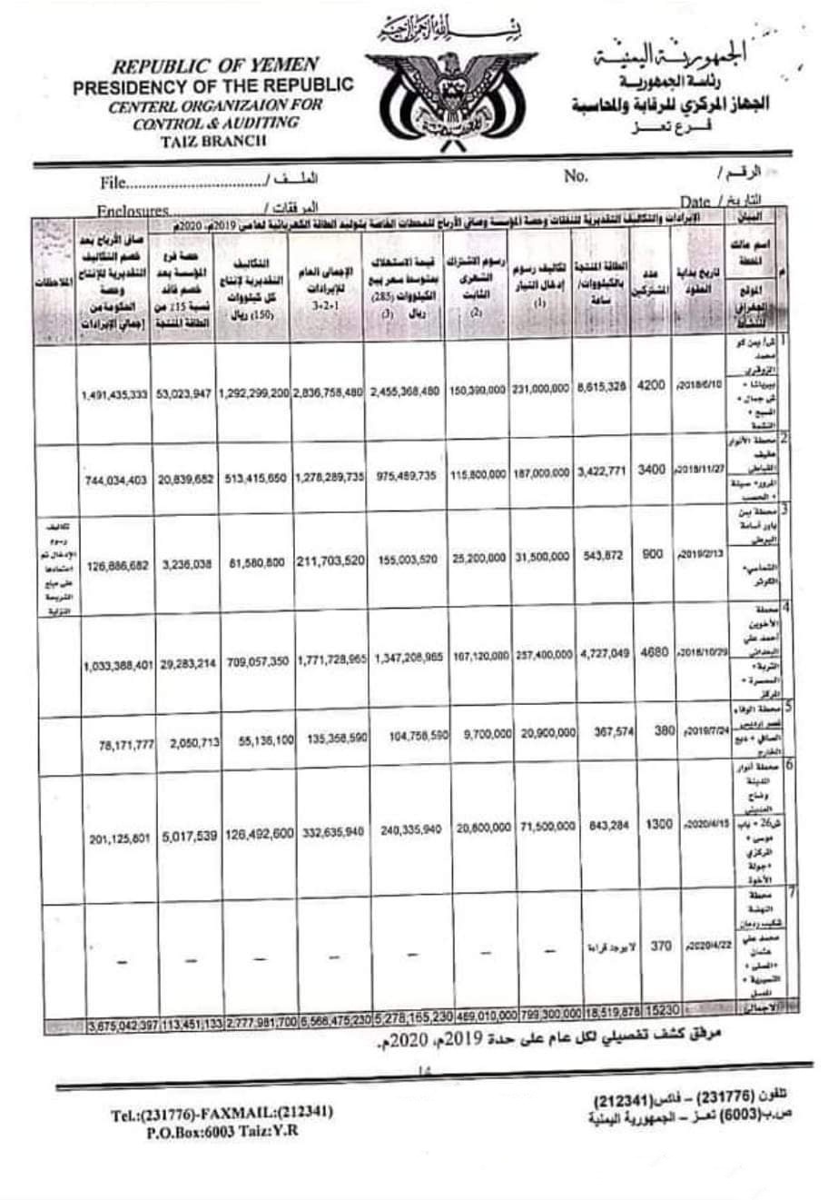 اما عن حجم الأرباح التي يجنيها تجار الكهرباء التجارية، فمن خلال بحثنا وتتبعنا للوثائق حصلنا على تقرير الجهاز المركزي للرقابة والمحاسبة لعامي 2019، 2020، الذي يوضح حجم هذه المبالغ المهولة، حيث يبلغ صافي الأرباح للعامين المذكورين، حوالي ثلاثة مليار وست مئة وخمسة وتسعين مليون وثلاثة وأربعين ألف وأربع مئة ريال يمني، فيما بلغ عدد المشتركين خلال العامين حوالي 16 ألف مشترك كما هو موضح في الوثيقة التالية: