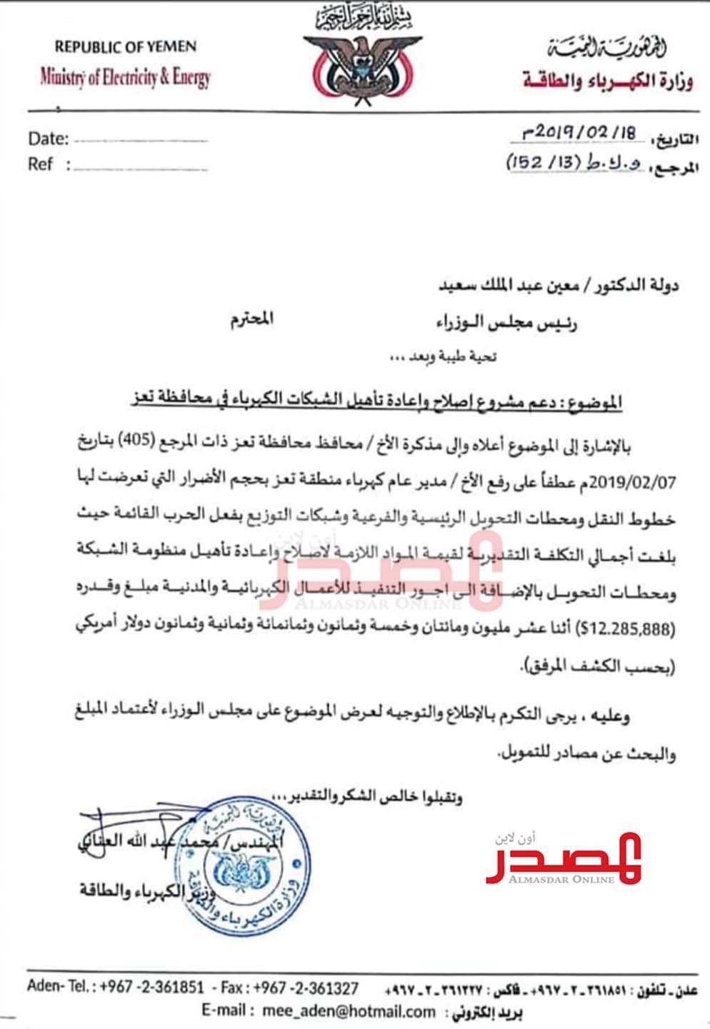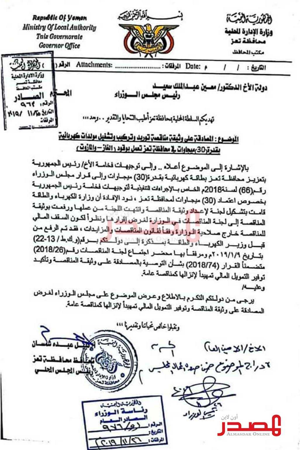في العام ٢٠١٩ قدم محافظ محافظة تعز طلباً الى رئيس مجلس الوزراء معين عبد الملك من أجل اعتماد مولدات بقدرة 30 ميجا وات، وافق مجلس الوزراء على الطلب بعد أن عرض عليه، ولكن المشروع ما يزال حبراً على ورق حتى الحظة، ولم تحصل تعز منه على شيء.