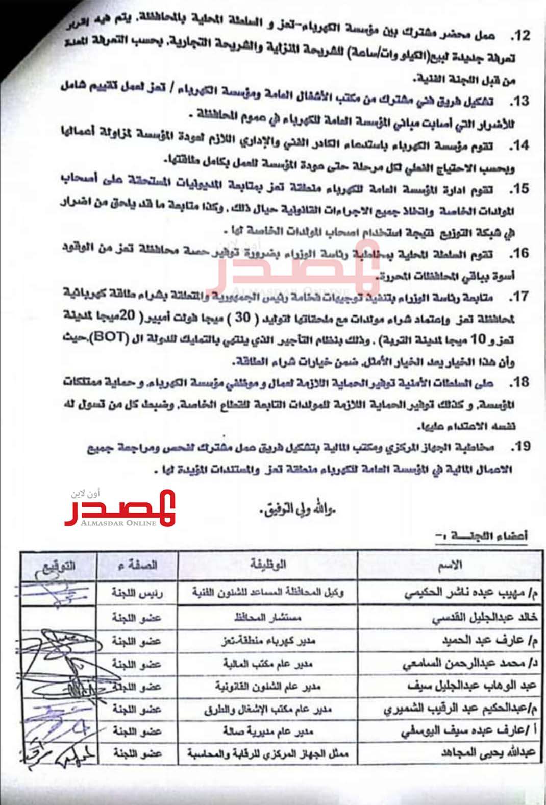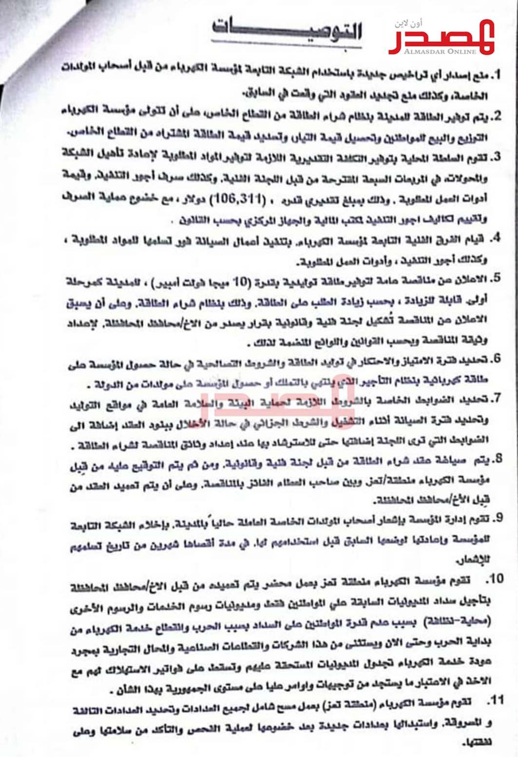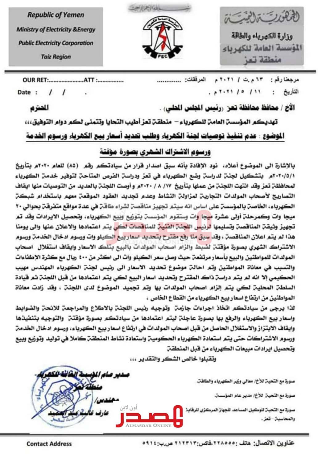 وفي وقت لاحق، شكت مؤسسة الكهرباء الى المحافظ أن تلك التوصيات لم تنفذ، حيث قالت إن تلك التوصيات أحيلت إلى رئيس لجنة الكهرباء المهندس مهيب الحكيمي، إلا أن تلك المقترحات لم تدرس ولم تحدد أسعار الكهرباء.. وهو ما تشير إليه الوثيقة التالية الصادرة بتاريخ 11 مايو 2021: