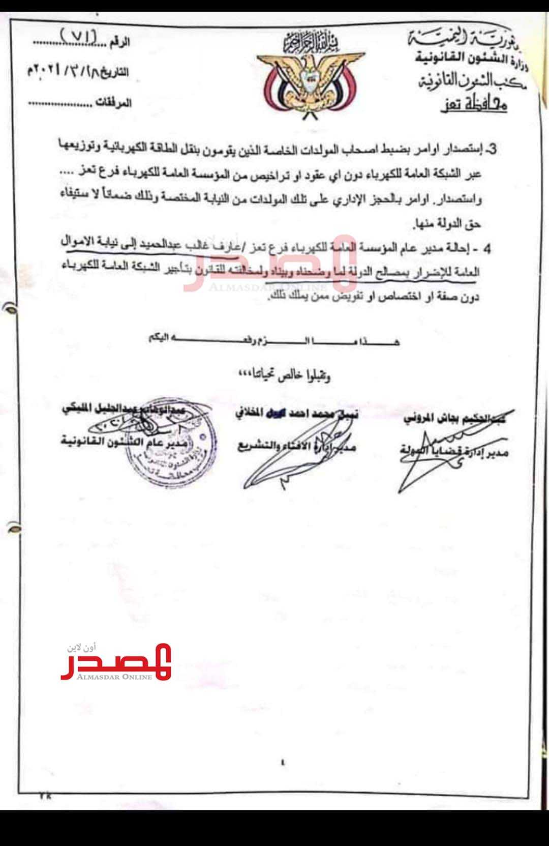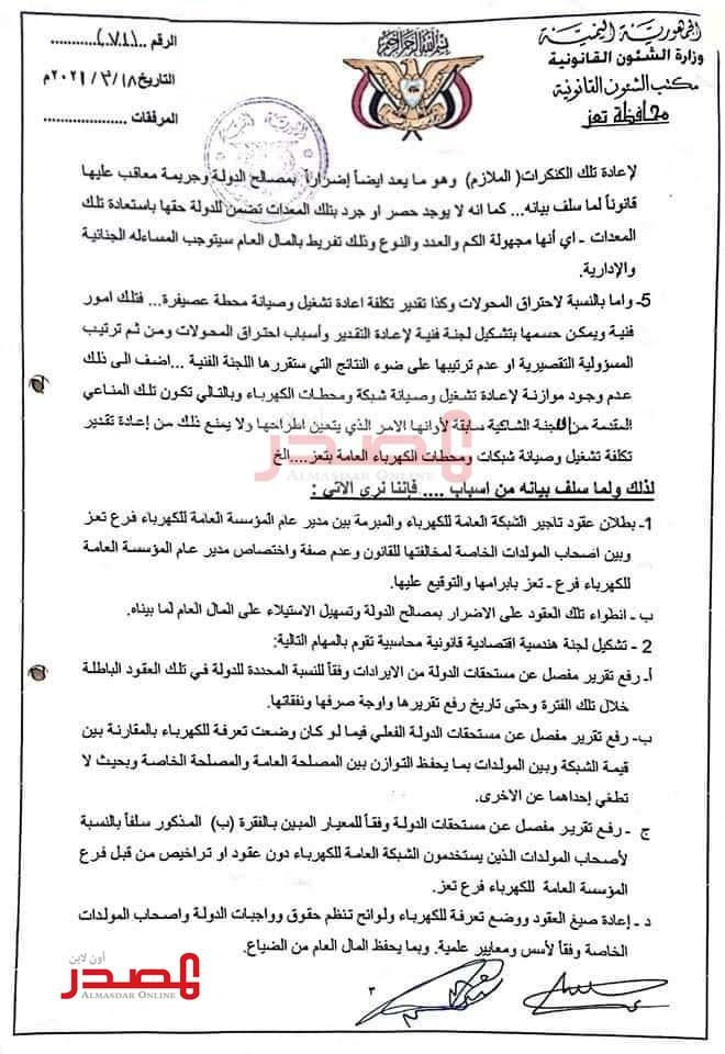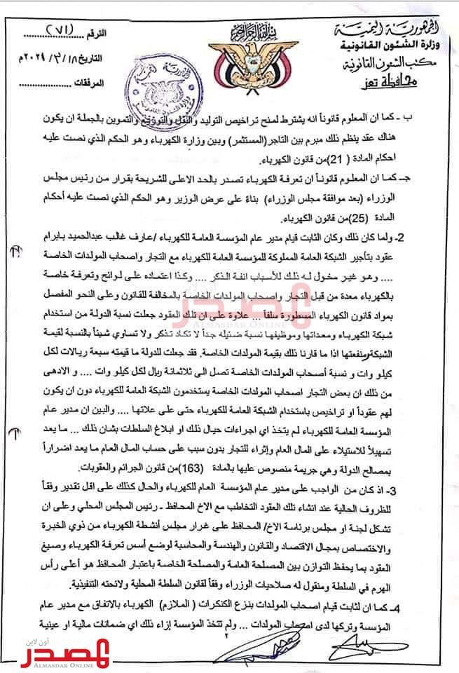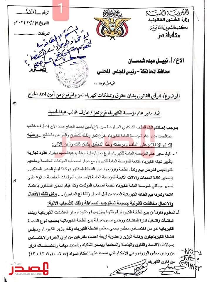 ويظهر تقرير الشؤون القانونية بالمحافظة المقدم للمحافظ بتاريخ 18 مارس 2021، حول "الرأي القانوني بشأن حقوق وممتلكات كهرباء تعز والمرفوع من أمين أحمد الحاج ضد مدير الكهرباء السابق"، أن الأخير قام "بتسخير كافة المعدات والآلات التابعة للمؤسسة العامة، لأصحاب المولدات الخاصة، علاوة على تسخير موظفي المؤسسة لخدمة أصحاب المولدات".