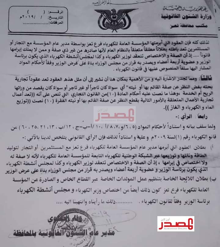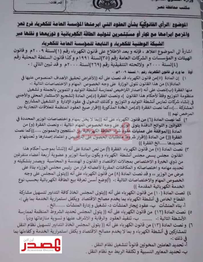 وفي هذا الصدد تقول وفاء الصلوي مديرة الشؤون القانونية السابقة في المحافظة لـ"المصدر أونلاين" إن مدير الكهرباء السابق أبرم العقود استناداً إلى وثيقة صدرت من جهة الحوثيين، وإن هذه الوثيقة باطلة، كونها لم تصدر من الحكومة الشرعية المعترف بها دولياً، وإنه (المدير) قام بالتلاعب واستعطاف المحافظ السابق من خلال التجار الذين توجهوا إليه بقولهم إن تعز تعيش في ظلام دامس بسبب خروج المؤسسة العامة للكهرباء عن الخدمة.