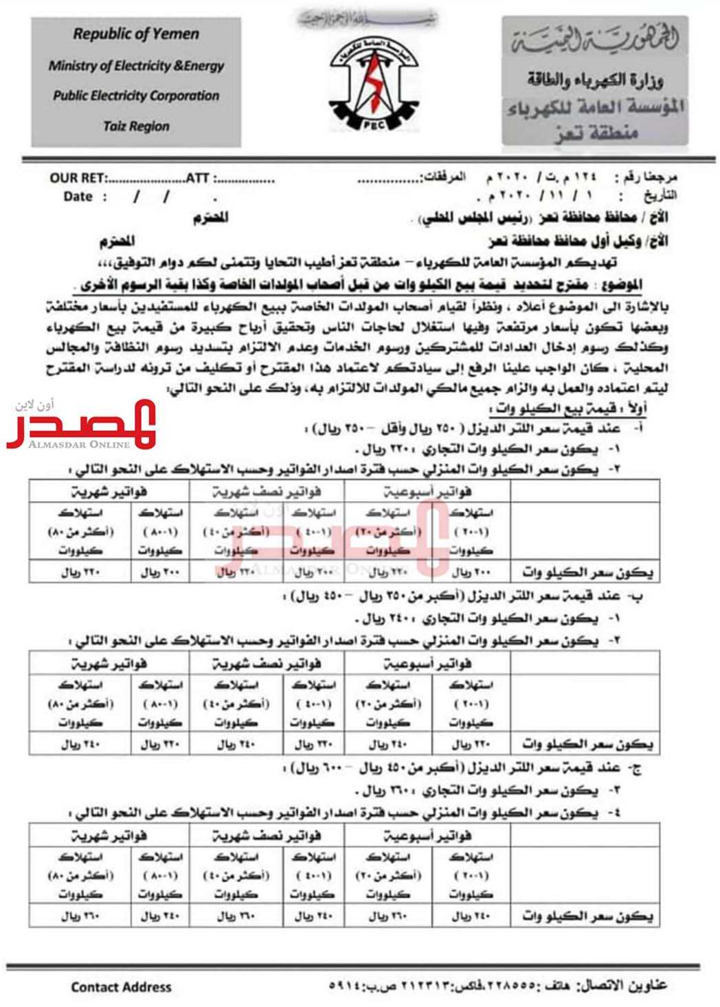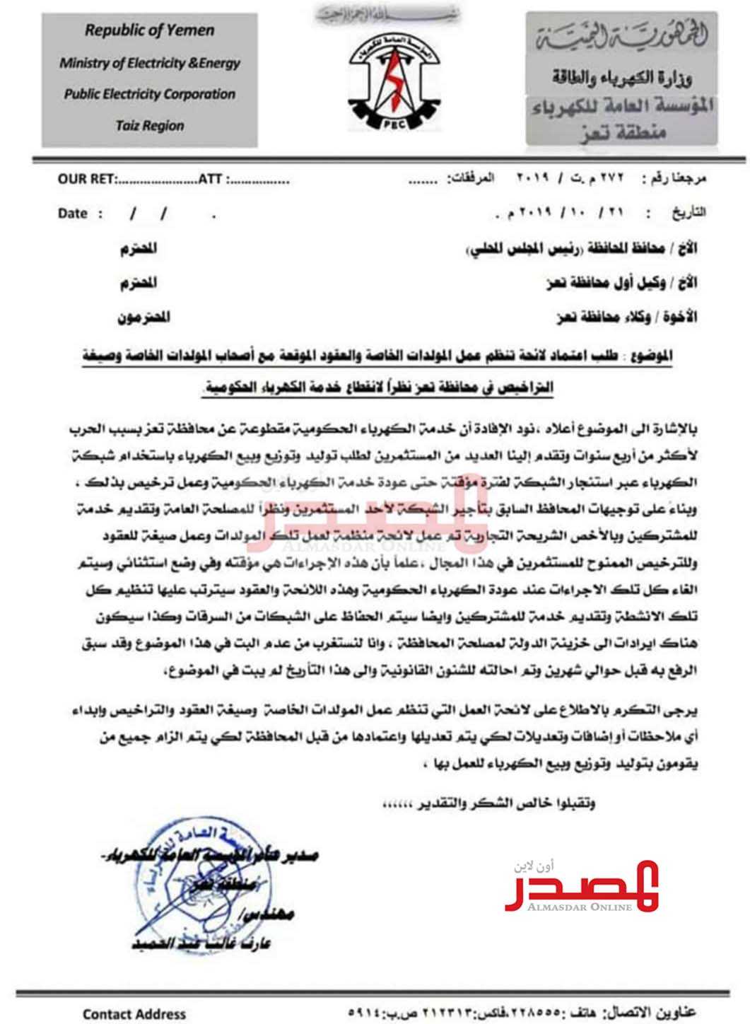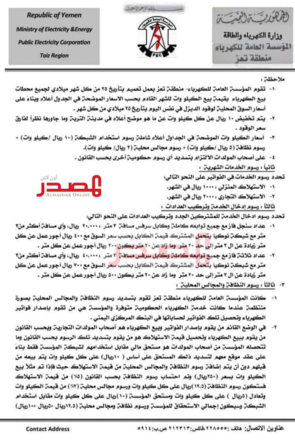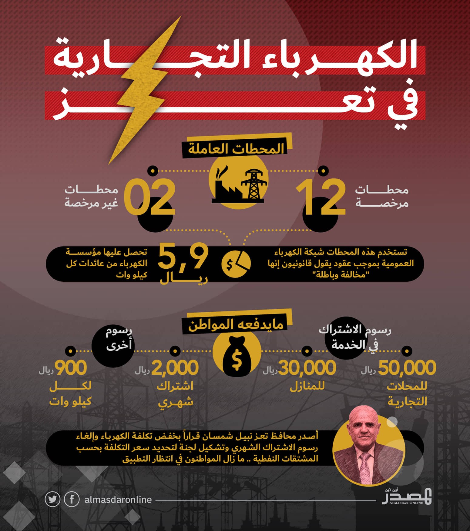 وفي وقت سابق أصدر محافظ محافظة تعز نبيل شمسان قراراً بخفض تكلفة الكهرباء التجارية، كما أمر بإلغاء رسوم الاشتراك الشهري التي يفرضها التجار على المواطنين، وتشكيل لجنة لتحديد سعر التكلفة بحسب أسعار المشتقات النفطية، وحدد سعر التكلفة للخدمة كما هو موضح في الوثيقة التالية.