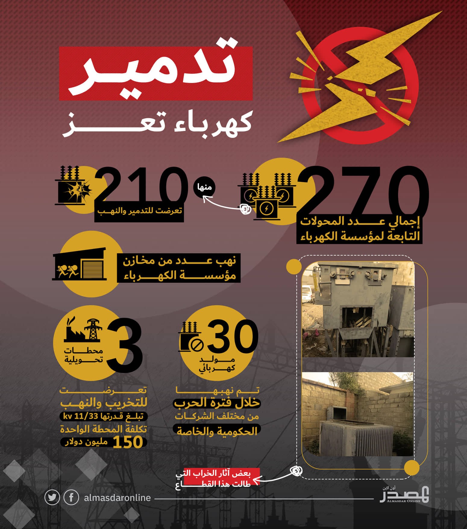 ويضيف: كان لدى المؤسسة 270 محول كهربائي مختلف القدرة والحجم، دمرت 210 منها، وخربت، مشيراً إلى أن قيمة هذه المحولات المخربة تقدر بحوالي مئة وعشرة مليون دولار، بحسب دراسة أولية أجرتها إدارة كهرباء تعز، ولم تشمل هذه الدراسة المناطق الريفية ولا المناطق التي تقع تحت سيطرة الحوثيين.