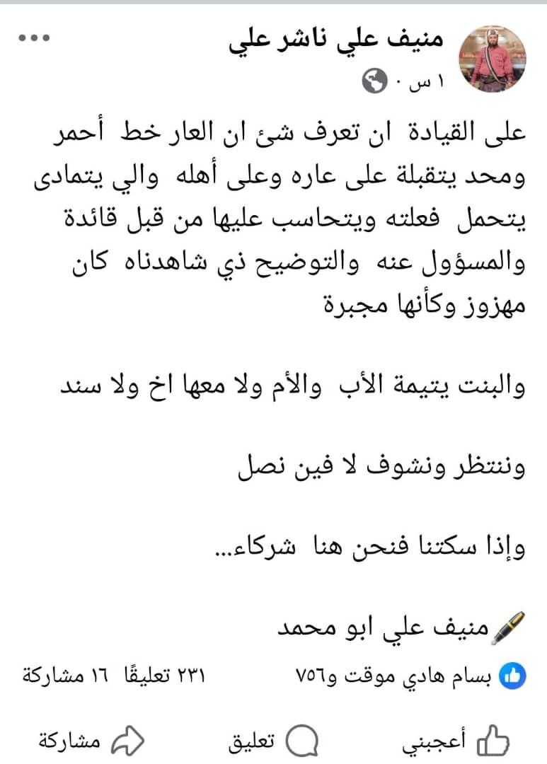 وفي أول تعليق رسمي يُؤكِّد الحادثة، قال نائب مدير العلاقات العامة بشرطة محافظة لحج، منيف علي ناشر علي، في منشور له على الفيس بوك تابعه " المصدر أونلاين "، إن القضية تمس قيم المجتمع ولا يمكن القبول بالتهاون فيها، مؤكداً أن "العار خط أحمر ولا أحد يقبله على عرضه أو أهله"، في إشارة إلى خطورة ما جرى.